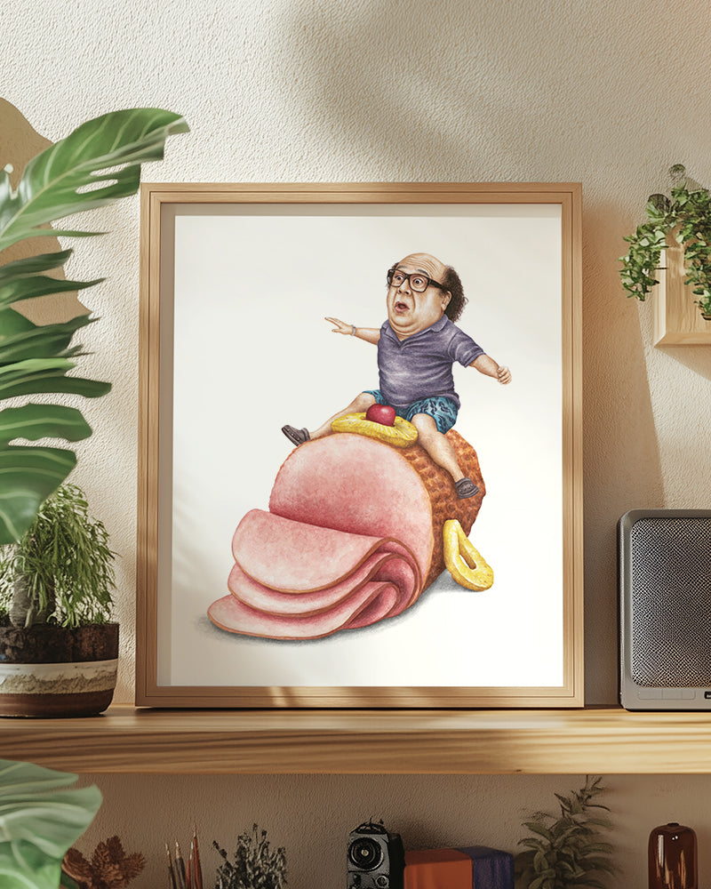 Premium quality watercolor print of Danny Devito as Frank from It's Always Sunny in Philadelphia riding a rum ham.