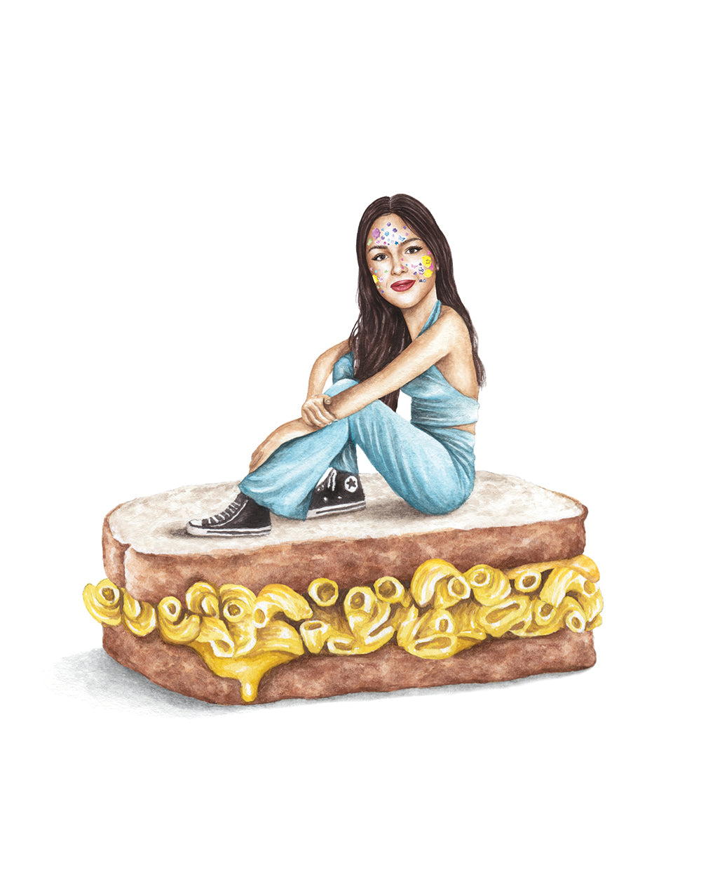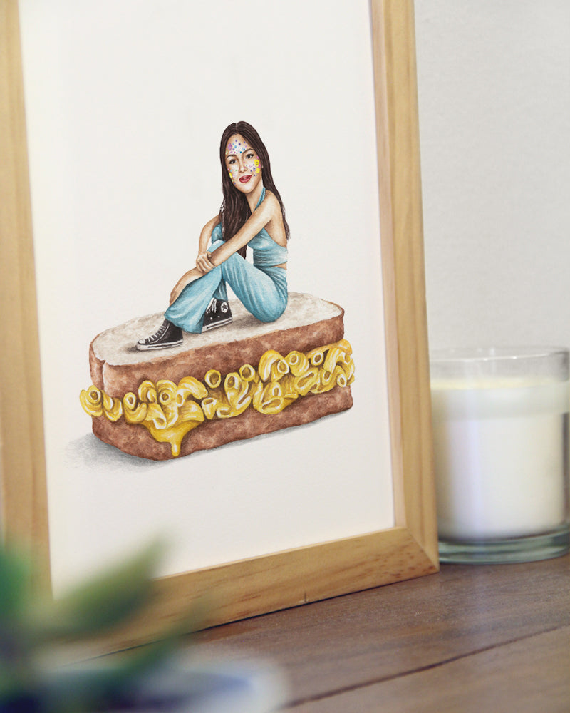 8"x10" watercolor print of Olivia Rodrigo on a grilled mac and cheese . Printed on heavy weight, acid-free, fine art paper with a lightly textured surface. Does not include frame.