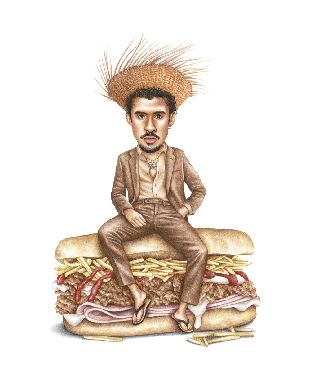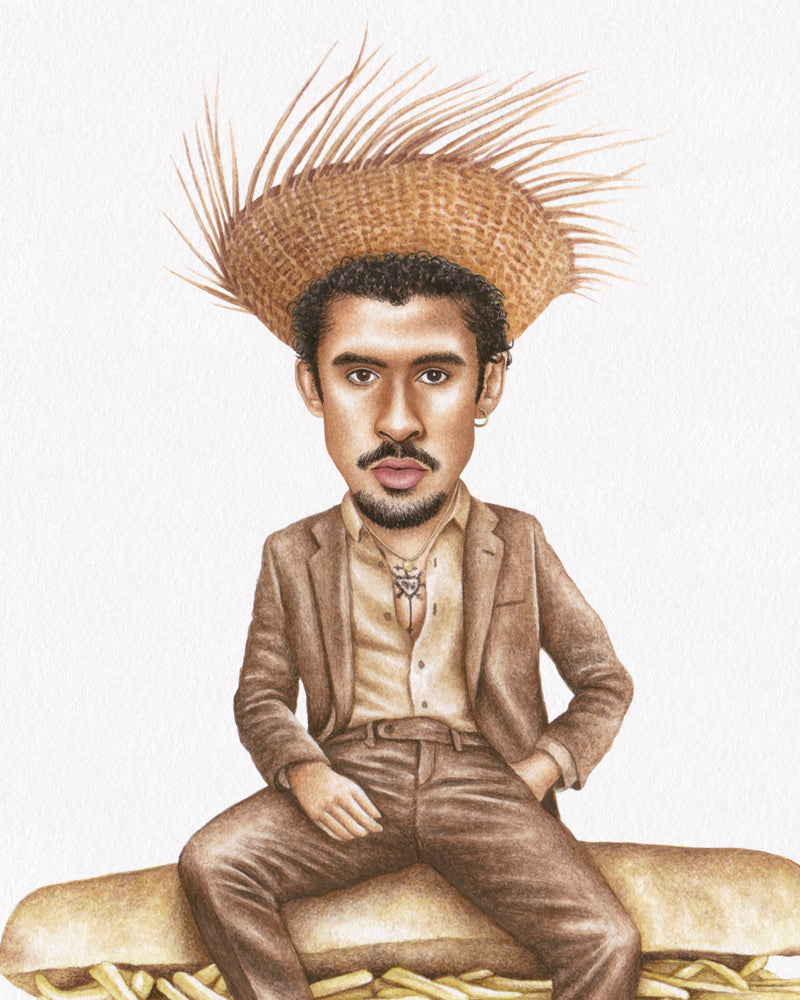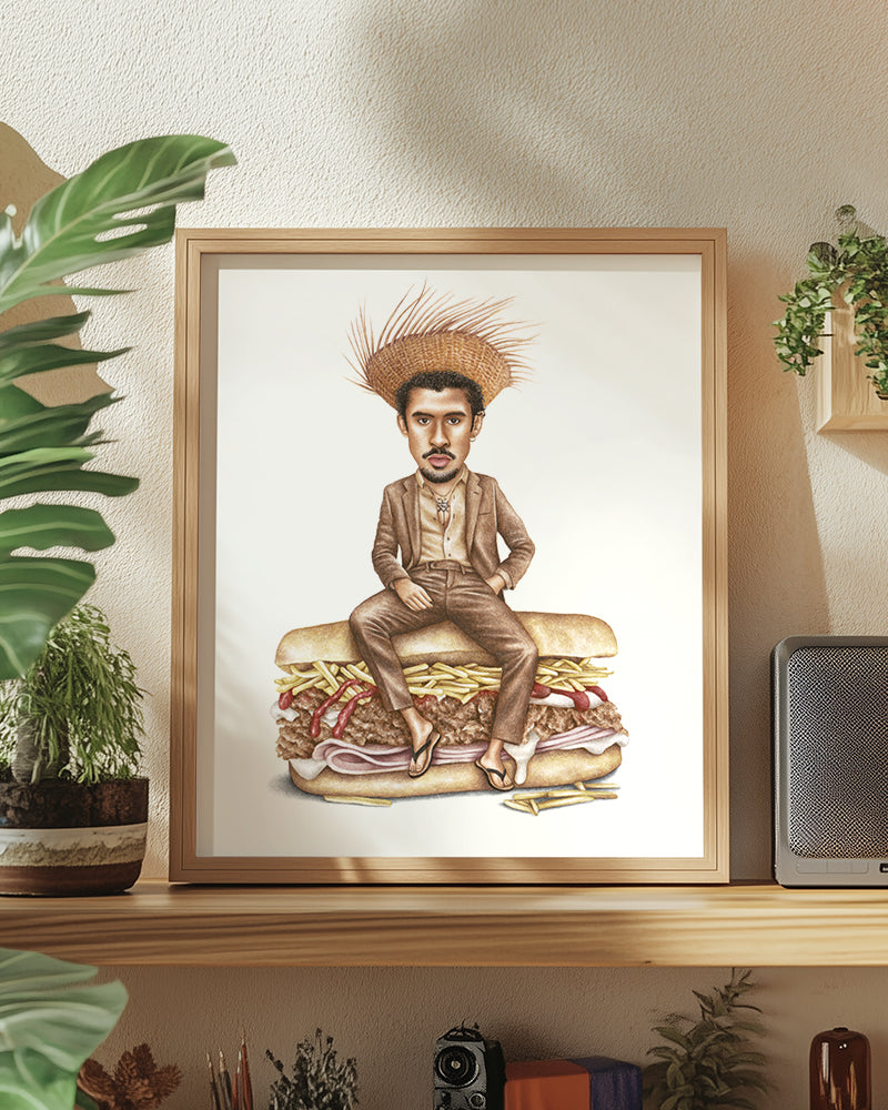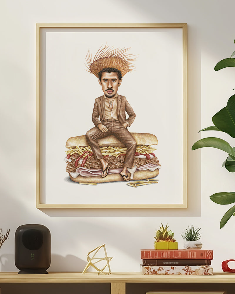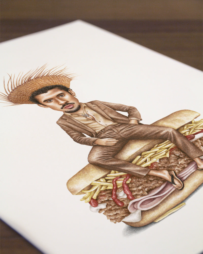 Premium quality watercolor print of Benito aka Bad Bunny on a Puerto Rican tripleta with ham, roasted pork, potato strings, ketchup and mayo.