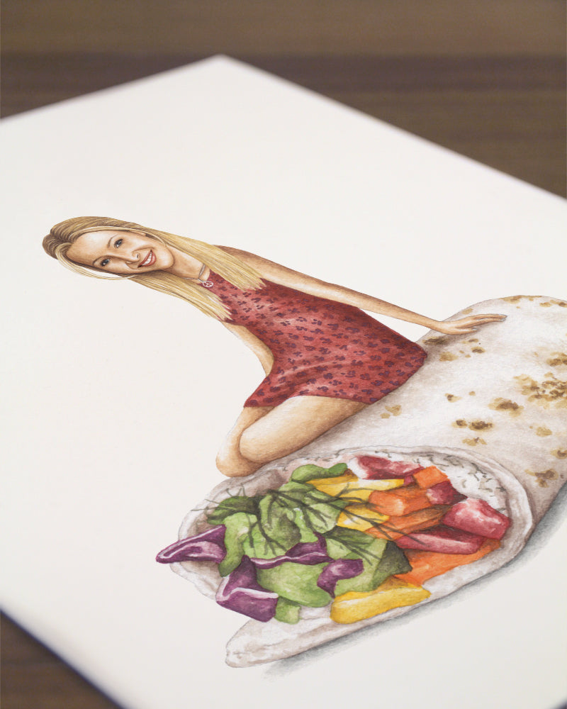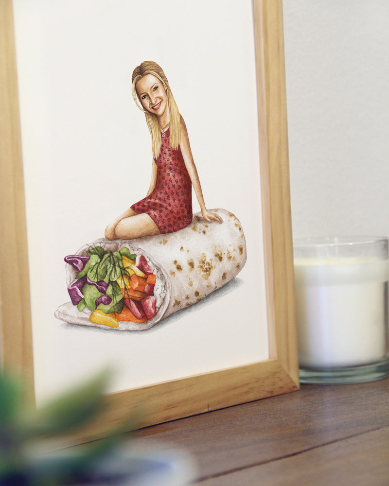 8"x10" watercolor print of Lisa Kudrow as Phoebe Buffay from Friends on a veggie wrap. Printed on heavy weight, acid-free, fine art paper with a lightly textured surface. Does not include frame.