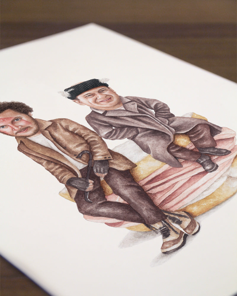 8"x10" watercolor print of the Wet Bandits from Home Alone on a bologna sandwich. Printed on heavy weight, acid-free, fine art paper with a lightly textured surface. Does not include frame.