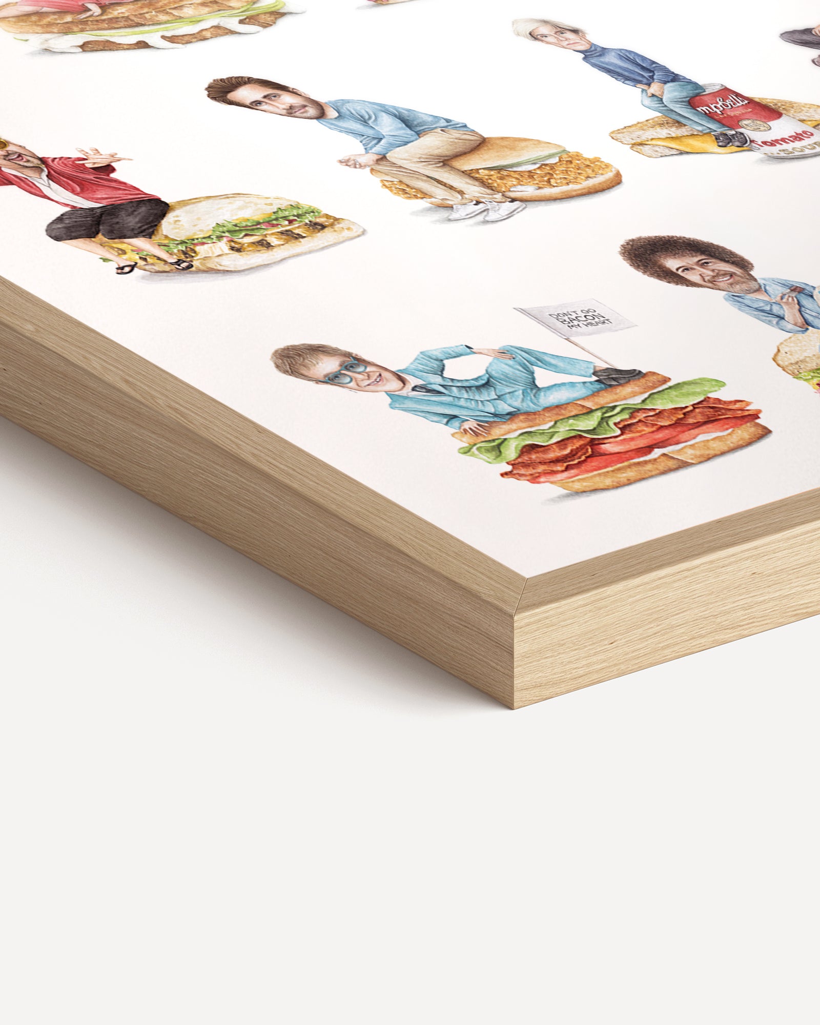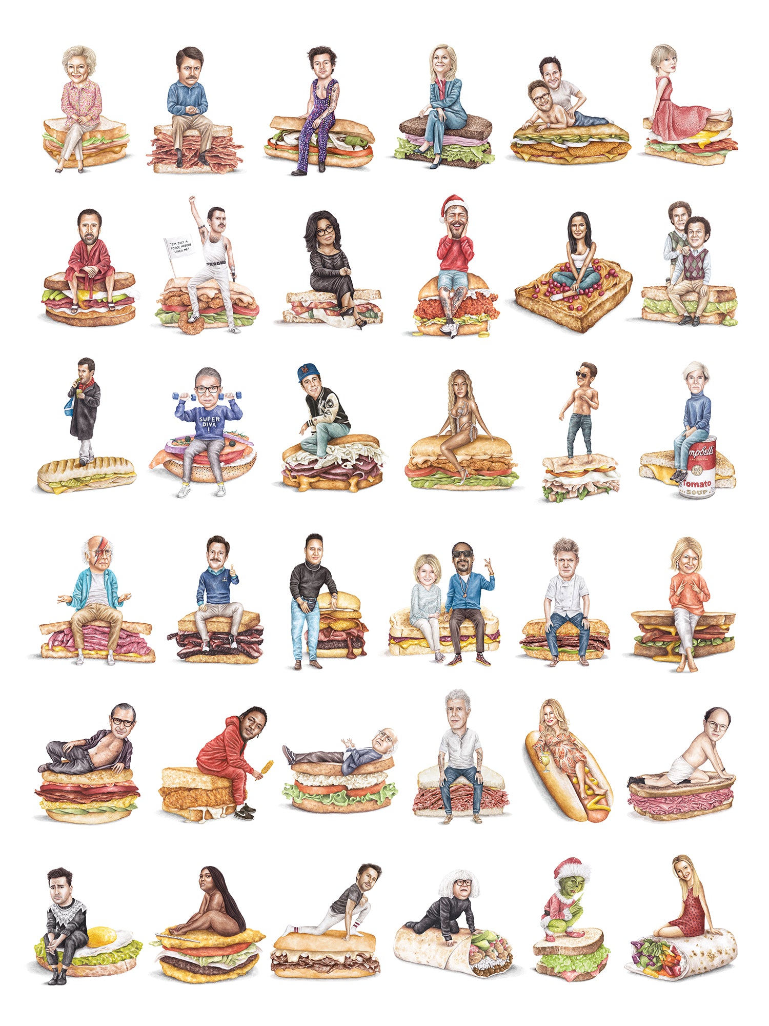 Version #4 of the limited edition 18"x24" watercolor print featuring 36 celebs on sandwiches. Printed on heavy weight, acid-free, fine art paper with a lightly textured surface. Frame is not included.